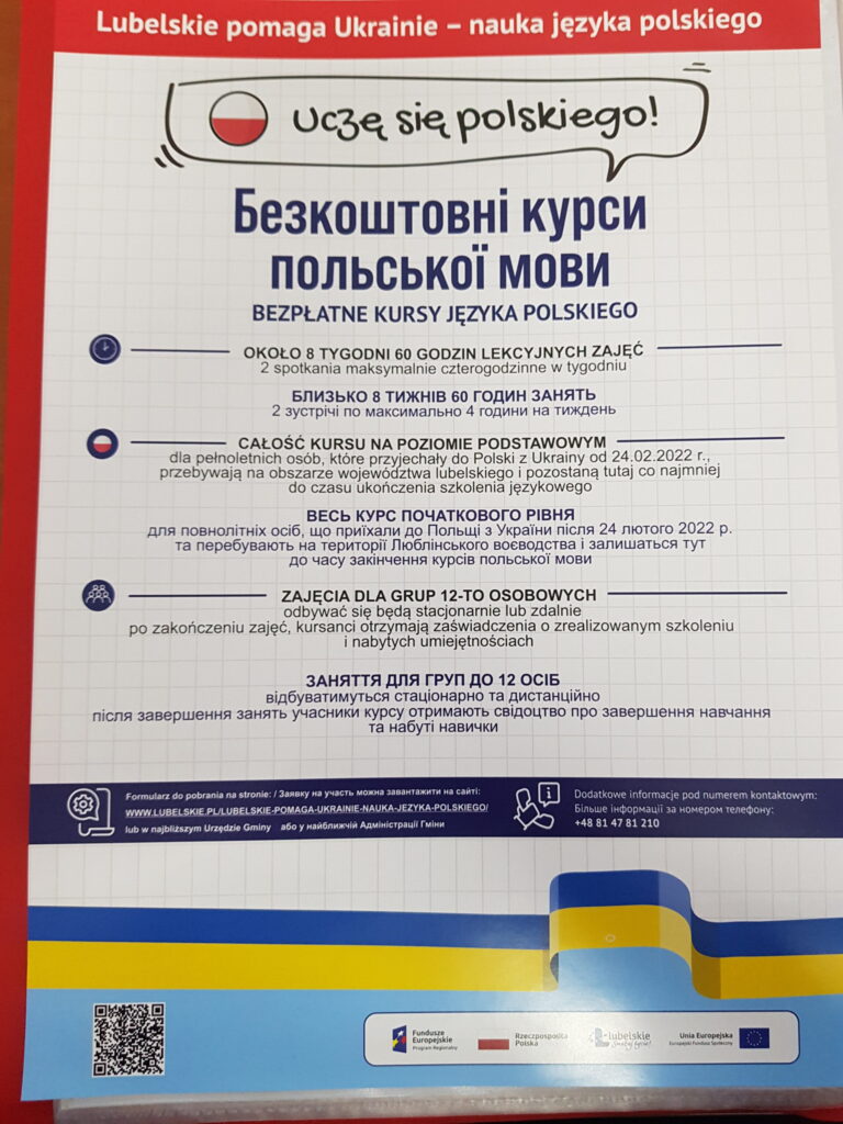 „Świadczenie usług edukacyjnych w Zakresie nauczania języka polskiego dorosłych osób uciekających z terenu Ukrainy w związku z atakiem Federacji Rosyjskiej na Ukrainę, które przybyły legalnie na terytorium Rzeczpospolitej Polskiej od dnia 24 lutego 2022 w podregionie lubelskim obejmującym Miast Lublin oraz powiaty lubelski, lubartowski, łęczyński, świdnicki.”
